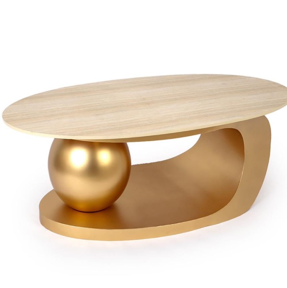 طاولة قهوة بتصميم حديث من الصاج مع كرة رخام ذهبية وسطح بديل رخام شبيه الترافنتينو باللون الذهبي